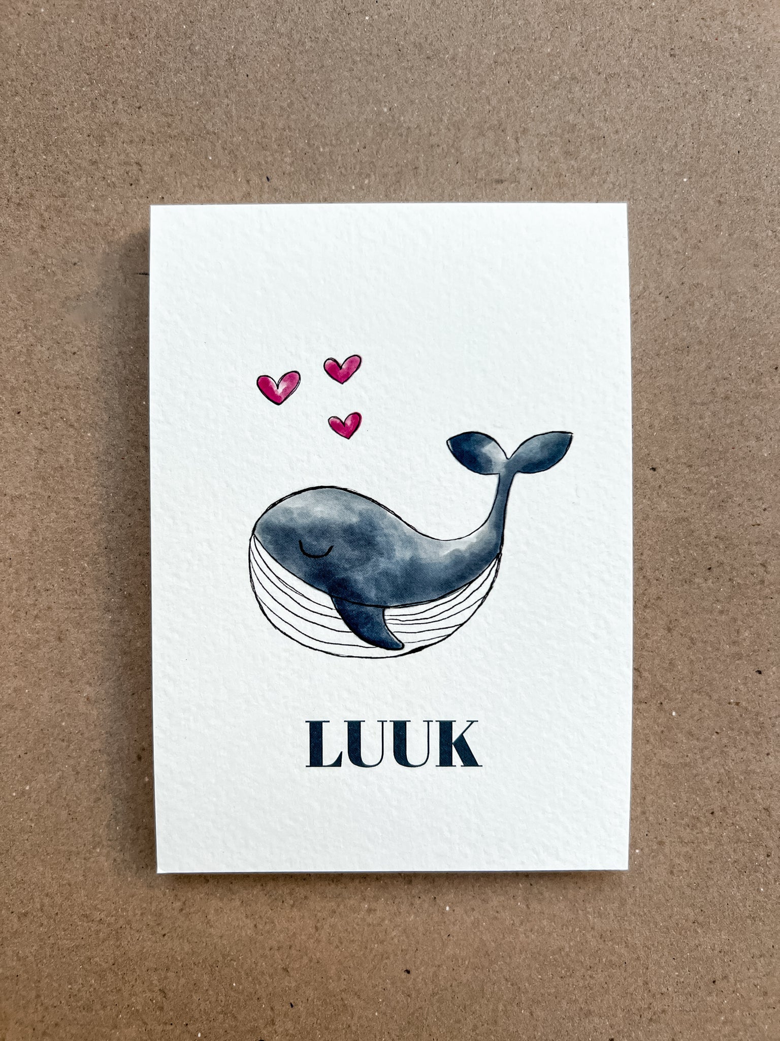 Het watercolor walvis kaartje met hartjes. Een teder, maar toch stoer ontwerp.